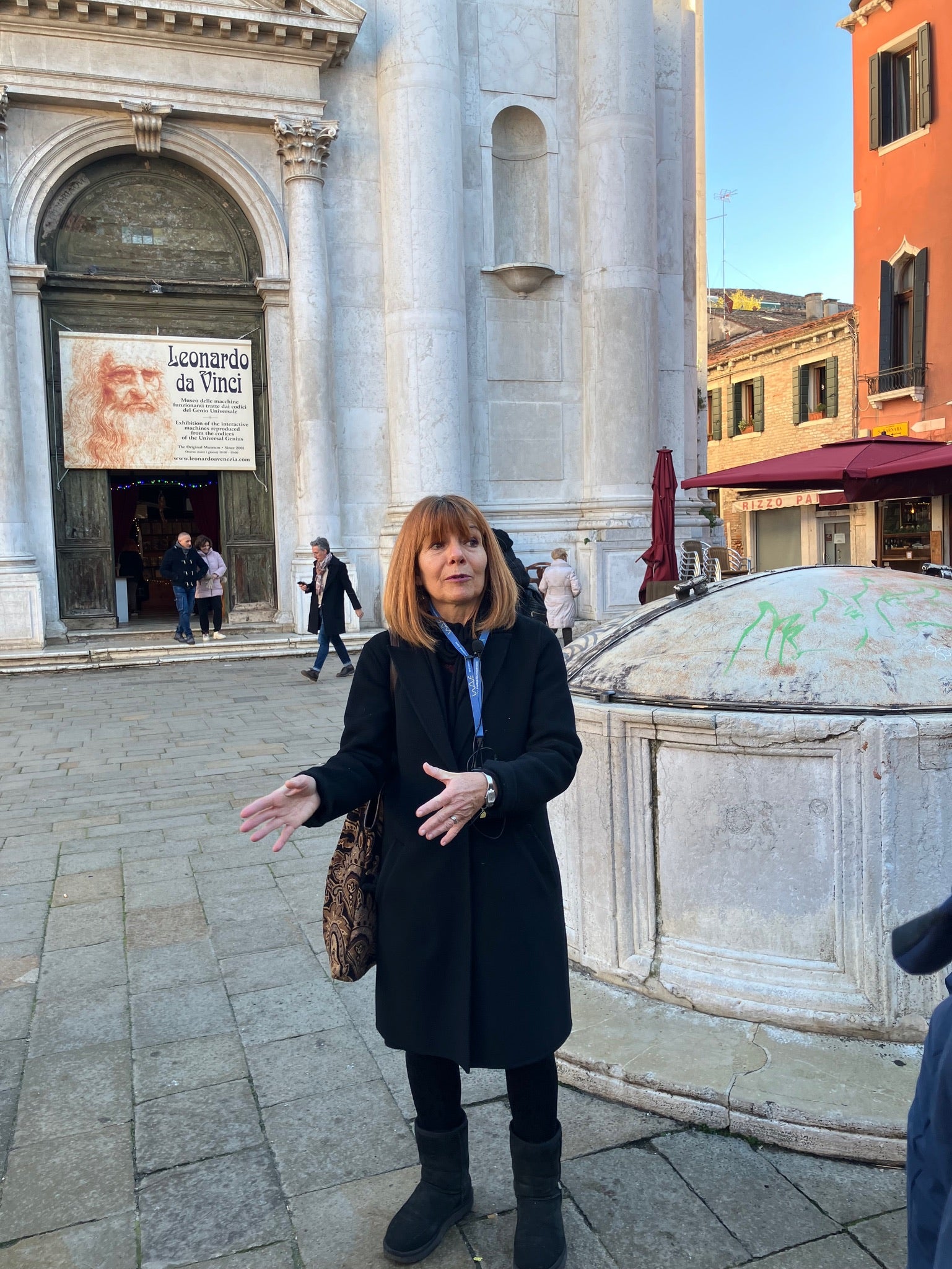 Vores personlige guide under hele opholdet i Venedig er den dansk/italienske Christina Stangalino, som bor fast i Venedig. Hun er datter af dansk/italienske forældre, og flydende i både dansk og italiensk. Christina er en fuldstændig forrygende dygtig guide - ikke mindst på biennalen, hvor hendes egen personlige interesse for kunst, er med til at få os til at forstå baggrunden for de forskellige landes temaer og de udstillede kunstværker.