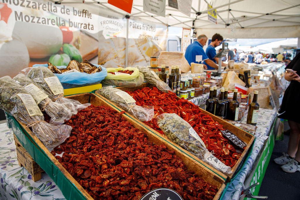Vi ankommer om torsdagen og kan således nå at runde det ugentlige marked, der først lukker kl 13.00. Langs med havnepromenaden er der fyldt med boder med madvarer, oste, grøntsager, pestoer i mange afskygninger, men også tøj og duge og tasker.